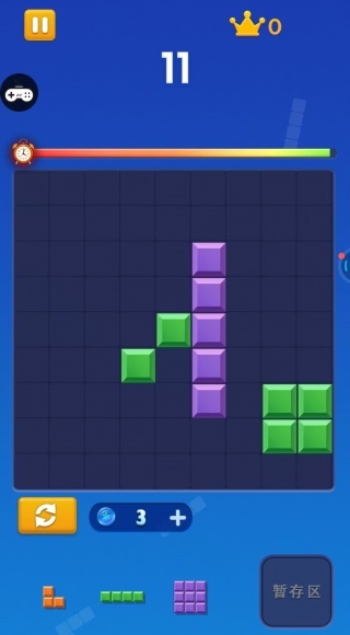 3、在计时模式中,要快速辨识方块的形状以及网格里的空缺位置,优先去处理那些能够组成完整行列的方块组合,要是碰到难以放置的方块,可以先暂时存放起来。
