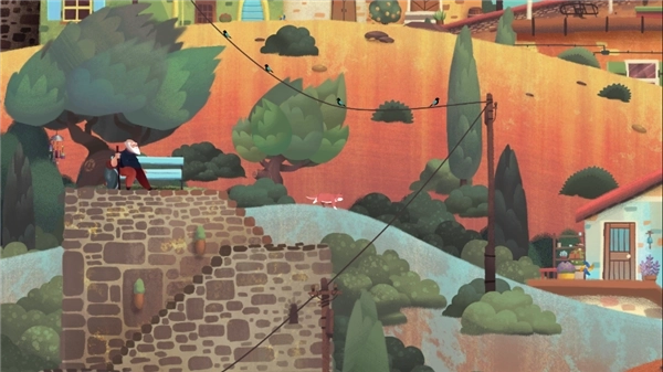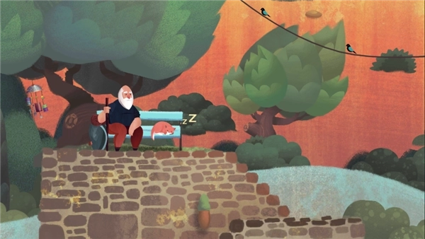 3、触发剧情:点击那只正在睡觉的懒猫,它就会被惊醒,随后跳到前方的房顶上,而老人也会站起身来,准备继续前行。