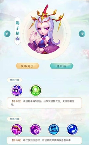 蝎子精的技能已进阶为倒马毒桩,每次遭受攻击时,有较大概率使攻击者陷入中毒状态;倘若攻击者已处于中毒状态,蝎子精则可获得减伤效果。
