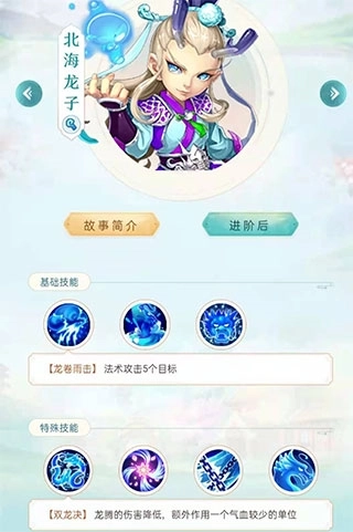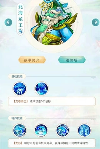 北海龙王:进阶后的北海龙王,其龙甲已升级为时乘六龙;当北海龙王变身时,能够为队伍提升物理防御与法术伤害。