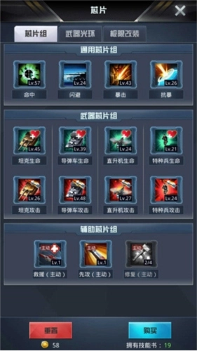 第二点,关于战役方面,有个关键问题得提一下,就是前期用来打关卡的兵种等级。我比较推荐“一刀流”的玩法,核心是走导弹路线,不管是科技、芯片还是配件这些,都要优先围绕导弹来配置。这里有个重要的点:等导弹兵种出了橙色品质的载具后,再回过头来补升等级也完全来得及。不过光有导弹还不够,必须得发展副兵种——坦克。导弹负责输出伤害,坦克负责承受伤害,攻防结合,这才是最合理的搭配思路。
