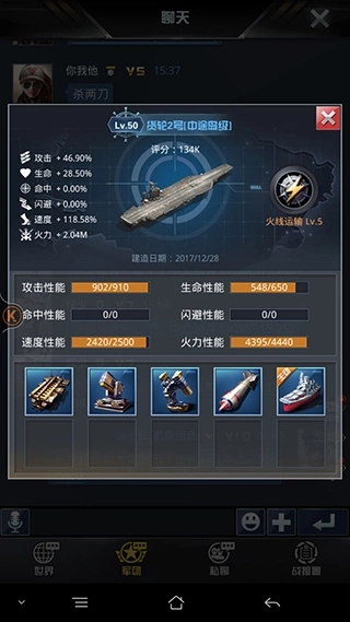 航母装备的四个最高评分项分别是穿刺、防护、命中和攻击。