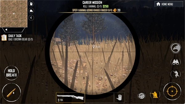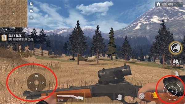 1、准星由屏幕中心区域操控,右下角为子弹发射键,左下角是开镜按钮;开镜状态下,通过滑动镜头边缘可提升放大倍数,同时能在右下角开启红外线功能。屏幕左右两侧均设有移动按键,猎人可借此左右移动以调整至合适视角,不过移动范围相对有限。