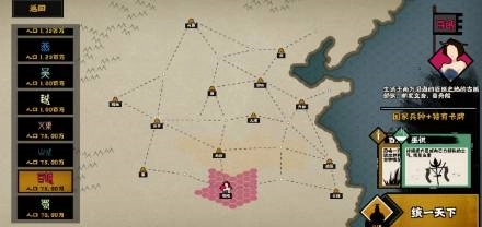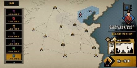 2、燕国:这国家右上角,开局带一个小城池,点完民生里两个发展的,直接打边上那个村子。这时候兵应该不多,先苟着。期间点出偷窃,这模式bug级技能。直接偷,左上角九原,反复偷,苟着。期间隔三差五天天赵,兵够就打赵,先打他和北戎之间的。别去打北戎,开局她太猛了,手段很残忍。打完持续偷北戎,期间战斗力多点,民生多点。对了,前期把李牧的据守点出来,打架很好用。把赵国的土地全收了,差不多就可以稳一会。因为你兵不怎么多了,避免土地太多没兵。期间齐国那傻缺会隔三差五来打你,记得升级邯郸的城防(墨子可以加城池的血,好像是守家比较肉)。之后看时局,兵多钱少就到处打架,打完就剥削,别管有没有民心,民心降到0造反就重新打,又可以剥削一次。兵少钱多就苟着,多余的行动力可以拿来偷偷偷。后期基本就是捡漏,或者强推。