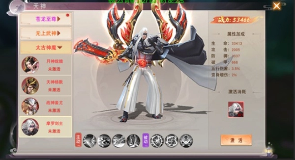 玩家获取对应的天神物品后,能够激活该天神的形象,激活形象后会得到属性加成与主动技能。已激活的天神形象可以选择出战:玩家可通过消耗特定物品或提升自身等级来解锁更多出战槽位。处于出战状态的天神,能够在游戏场景中变身为实体形态参与战斗。激活后的天神形象还能消耗三种指定材料进行升阶操作,升阶后会显著提升属性战力,当阶级达到特定等级时,还会解锁对应的被动技能。