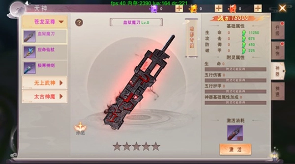 消耗对应的天神物品即可激活天神神器,激活后可通过强化、升星、附灵等培养方式为神器提升大量属性战力。