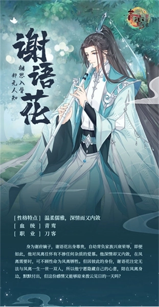角色经历:作为谢府的嫡子,谢语花出身显赫,自小便肩负着家族的兴衰荣辱。尽管如此,他对凤离的爱慕纯粹无瑕。他情深意重却又含蓄内敛,每当凤离有需要,他都能不顾自身安危挺身而出。然而,碍于双方的身份差异,谢语花深知自己无法与凤离相守一生,于是选择将这份心意深埋心底,默默陪伴在凤离左右,不求回报地付出。只是,这份隐忍的感情,是否终有一天能迎来柳暗花明呢?