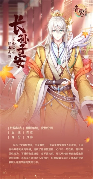 角色经历:长孙子安生得一副俊朗容貌,出身显赫尊贵,向来颇受身边人的喜爱。自幼养尊处优的成长环境,让他养成了骄傲别扭、口是心非的性子——他常常由着自己的性子行事,既不懂得刻意讨好他人,也厌恶被规矩束缚,可骨子里却单纯善良,爱憎分明。这样的性情本不适合踏入皇宫这等复杂之地,可他偏偏成了凤离的侍君,被禁锢在这座看似华丽、实则如同樊笼的深宫之中。