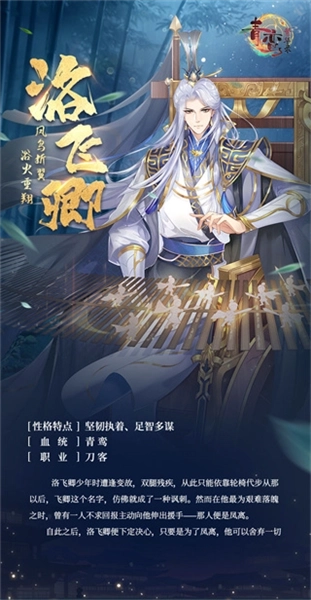 角色经历:洛飞卿的童年并不顺遂,一场变故让他的双腿落下残疾,往后的日子只能与轮椅相伴。自那时起,“飞卿”这个名字似乎成了命运对他的嘲弄。可就在他人生最灰暗潦倒的阶段,有个人毫无所求地向他递出了温暖的手——此人正是凤离。从这以后,洛飞卿便在心中立下重誓:只要是为了凤离,他甘愿付出所有。而后来的种种也印证了他的誓言并非空谈。为了凤离,他不顾自身安危潜入朱雀国;当青鸾国被敌军重重包围之际,他凭借超凡的智谋,与凤离内外配合,不仅成功迫使朱雀国撤兵,还能毫发无损地回到凤离身边。凤鸟即便暂时折损了羽翼,最终也能在烈火中重生,振翅高飞于九天之上,这无疑是对“飞卿”二字最贴切的注解。