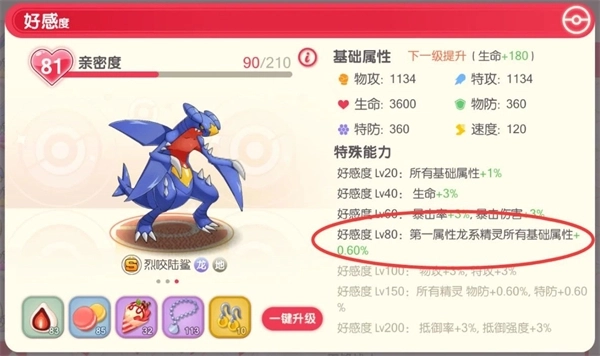 精灵的好感度不仅能提升自身属性与速度,80级的好感度还藏着特别的机制。比如当前龙系精灵使用频率较高,若筛选出所有龙系精灵,当它们的好感度达到80级时,会为第一属性是龙系的精灵增加0.60%的基础属性——这数值看似不起眼,实际能带来相当可观的速度提升。同样的道理,要是上阵的是其他属性的精灵,给那些未上阵的S、A、B级精灵提升好感度,也能增加主队中同属性精灵的战力与速度。