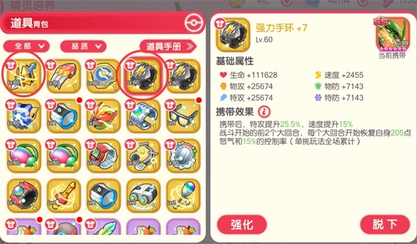 目前加速度的携带品有不朽之剑和强力手环。紫色携带品里王者之证也加些速度,但和前两者的速度差距还是比较明显。常有人问我橙色携带品到底要突破到几阶,其实橙携里除了强力手环和极巨腕带需要+2才能在第二回合释放必杀外,其他并没有特别硬性的突破要求,突破主要就是为了提升速度。不过从当前情况来看,超级裂空座和美洛耶塔对加速度的携带品需求非常高,而且是突破阶数越高越好的那种。