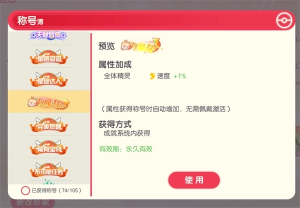 “升星狂人”这个称号的获取条件是让任意20个精灵提升到12星,它能带来1%的速度加成,而且不需要佩戴就能生效。