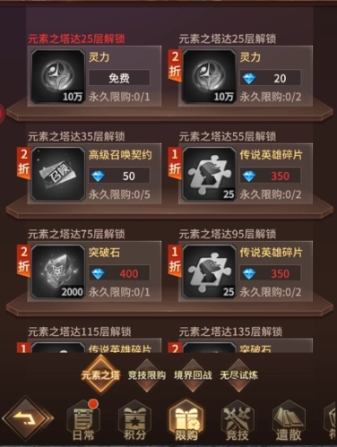 1、元素塔:是产出突破石、灵力和金币这三大必需资源的地方,每成功闯过10层,就会获得一个礼盒奖励,礼盒里装有传说英雄碎片、史诗级与传说级的高星装备,还有极为稀有的光暗属性碎片。元素之塔的限购商城中,陈列着各类限购的稀有道具。瞧见这么多奖励,而且都是超低折扣,小艾也忍不住要开启买买买模式啦~