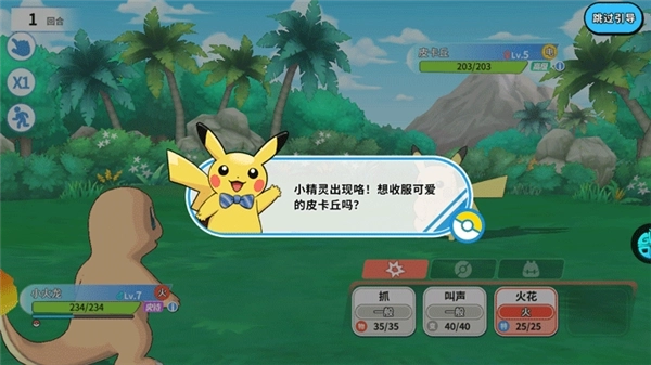 1、启动游戏后,前往草丛区域搜寻野外的精灵,我们成功发现了皮卡丘