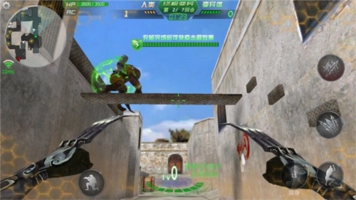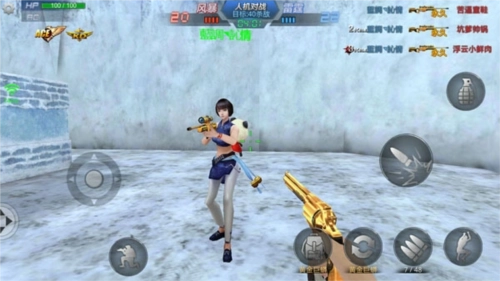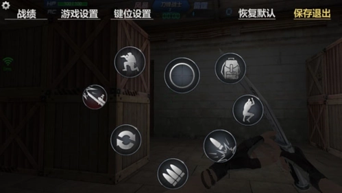 游戏画面左下角设有一个圆形虚拟按钮,右下角则有一个未显示的虚拟按钮,玩家可通过滑动这两个虚拟按钮来操控角色动作——左下角的按钮负责控制移动,右下角的按钮则用于调整准星与射击。此外,画面左上角的设置按钮集成了战绩查询、游戏设置及键位设置功能;左下角还设有蹲下按钮;画面右侧则分布着跳跃、切换武器、更换子弹、投掷手雷等操作按钮。