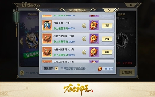 玩家每次通过试炼关卡都能获得一定数量的密令,当密令积攒到足够数量时,就可以前往密令商店兑换各种橙色防具。无论是基础装备还是后期的超凡高阶装备,都能通过开启对应的装备宝箱来获取,并且宝箱仅产出本职业装备的设定,也显得十分贴心。