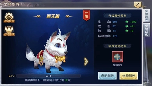 2、使用坐骑丹对坐骑进行驯养,能够提升坐骑的生命、攻击、防御等各项属性,从而为主人带来强力的属性加成。