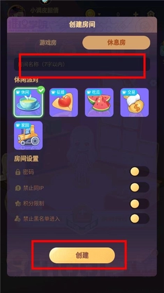 3、在休息房创建界面,输入房间名称,按需进行房间设置,设置完成后点击创建按钮。