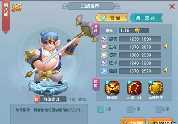 第二个猪八戒,登录第二天就能领取,第一天我打算用其他角色,比如判官就挺合适的。要不是第二天会送猪八戒,说不定我就一直用判官了。猪八戒属于前排肉盾型角色,他的技能能给友方前排套上护盾,还有一个技能可以提升友方前排70%的控制效果,另外他还有嘲讽技能,这样就有机会吸引敌人攻击自己,真是个超厉害的肉盾!