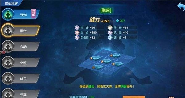 3:境界系统,初始阶段玩家需达成特定境界,方可上阵多个英雄,同时境界能为玩家提升战力。玩家可通过真气提升境界等级,而真气的获取途径十分丰富,包括门派比武、天命之塔、野外探索等!