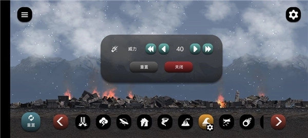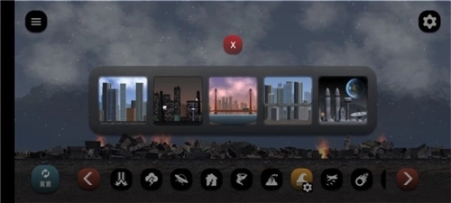 1、打开失控城市模拟器游戏后,在下方可以对城市选择行动,比如放烟花或者放炸弹,再次点击同一个行动就可以更改威力大小或者关闭了。