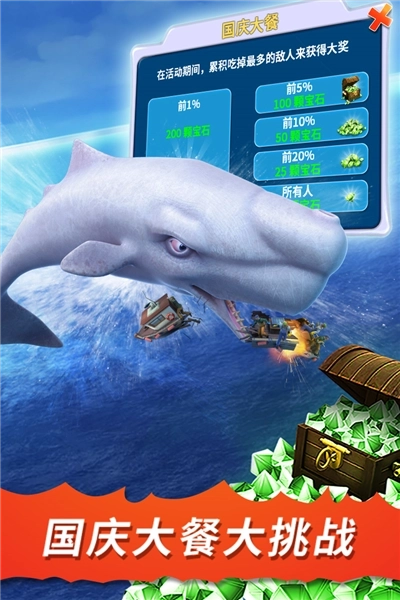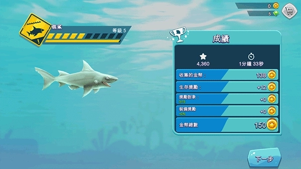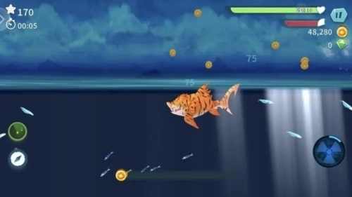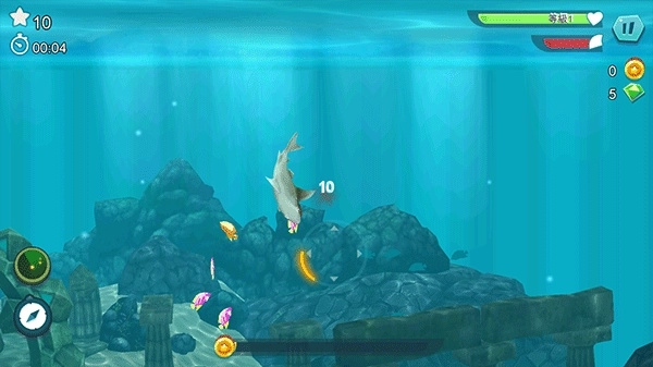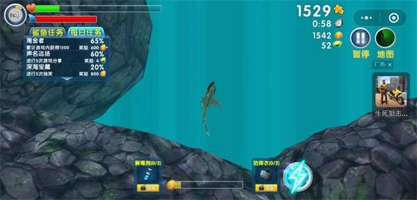 4、完成50个任务,寻找宝物取得金币与宝石,用来升级你的鲨鱼或者购买特殊救生道具。