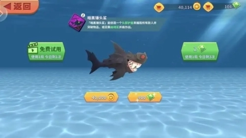 说到广告,现在游戏里有看广告试玩一些高等级鲨鱼的,我就试完了电鲨,闪电的技能真的很炫,整个海面颤抖,奈何我第一次接触电鲨,开始有些懵的,所以刚想要整明白的时候生命值已经耗尽拍到沙滩上了。建议萌新们想体验高技能鲨鱼时,因为试用机会难得,没有试错的机会,所以一定要提前科普做功课!