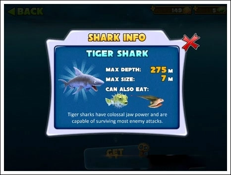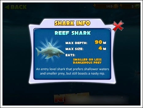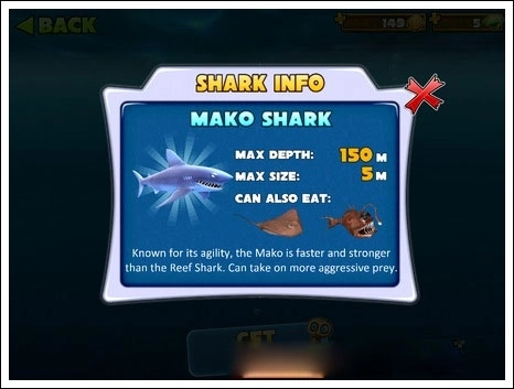 5、逐渐解锁更多水下凶猛野兽:灰鲭鲨、锤头鲨、虎鲨和无敌的大白鲨!
