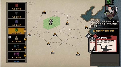 接下来玩家就得依据无悔华夏的地图来行动了,轩辕是相当关键的角色,而且九黎和东夷到了后期很难战胜。这三个作为三皇五帝剧本的首发势力,彼此之间的距离非常近,所以我推荐玩家选择最后一个势力,这样可以在消灭其中一个的同时转向进攻另一个,等击破这两个之后,玩家后续的征战就能轻松不少了。