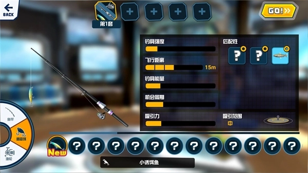 3、确定好钓鱼点之后,接下来要挑选钓鱼装备,不同的装备能钓到的鱼类各不相同,选好装备后点击右上角的GO按钮,就可以开始钓鱼了。