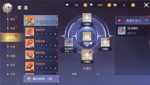 再就是镶嵌魂石,每一件装备都可以镶嵌5枚魂石,分别是提升攻击力的血晶石,提升破甲值的紫光石,提升生命值的翡翠石,提升防御的金刚石。在这4种属性中优先选择和升级加攻击力的石头,其次是生命值,然后才是破甲和防御。除了购买更多的魂石之外,还能够提升等级,相同等级的同名石头可以合成更高级的石头,属性大大提高。