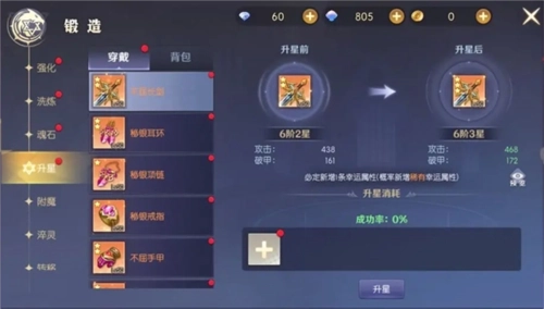 然后是装备升星需要达到橙色以上品质才能升星,升星之后有一定几率额外获得属性词条,消耗同名同品质装备可以有几率提高一颗星。这是只有在高阶装备时才会用到的方式初期不建议选择。