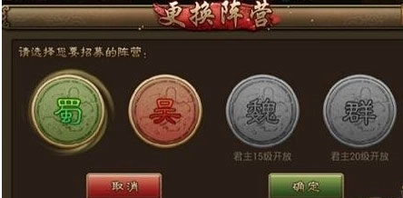 在您的阵营的武将足够多后,可选择更换招募其他阵营的武将,如果您选择的是蜀国,则系统会在君主等级10级,15级,20级的时候为您开放吴国,魏国,群雄阵营的招募。具体以您的阵营来定。