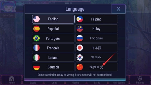 1、在本站安装加查艺术,运行游戏,选择右下角的“language”;