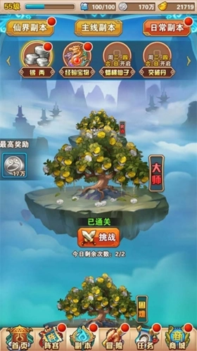 挑战日常副本,可以获得大量的资源,包括银两,经验宝物,蟠桃和突破丹。前期日常副本难度不高,每日可固定获得大量的资源,每天上线后记得尽早打掉。日常副本按照天数开不同的副本,今天不开的副本第二天就会开的。