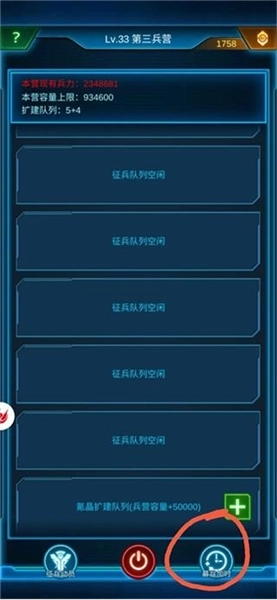 三、兵营右下角有一个可增加生产线造兵时间的按钮,消耗晶体可以增加生产线时间,最多到2.5小时。还有一个增加生产线数量的按钮,不过需要花氪金。生产线多,且时间长,才能多存兵。