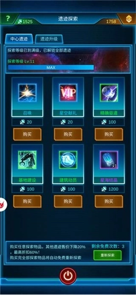 五、每天可免费5次刷新星海奇观。在奇观里有中心遗迹和黑洞遗迹。可以在中心遗迹消费模组,购买相应技能和“星海结晶”,同时可推进黑洞遗迹“进度条”,进度条满,自动开启黑洞遗迹,可白嫖一次,然后可用氪金随机抽取黑洞遗迹技能。(钱多没处花可以抽)黑洞遗迹开启后,会在72小时后关闭。如果在黑洞遗迹开启期间,你继续消耗模组,也不会推进这个进度条了,属于浪费。所以,如果黑洞遗迹未开启,你可以大手大脚花模组,推进进度条;如果开启了,你就要扣扣搜搜,攒模组。