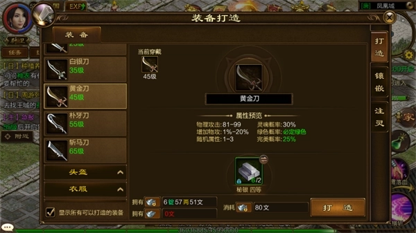 武器有刀、弓、杖、扇、棍,根据自身职业选择需要打造的武器,可以打造的武器等级为45、55、65、75、需要的材料为秘银,秘银三等及以上等级秘银才能打造武器。