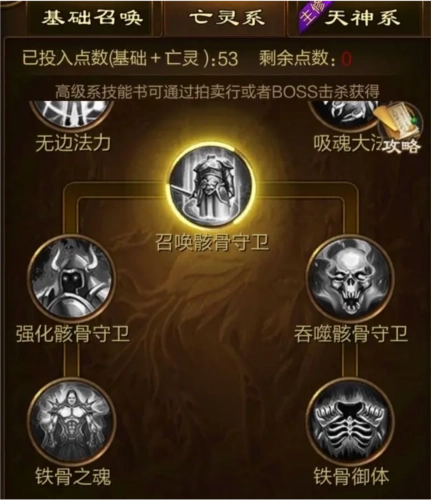 第一个亡灵系的技能,这个里面的技能就是属于召唤亡灵的一些技能了,就不会在召唤天兵和土灵那些了,就只会召唤骷髅大军和亡灵大军这些召唤目标了,其他的就是一些强化这些召唤的技能和一些加成属性技能了。
