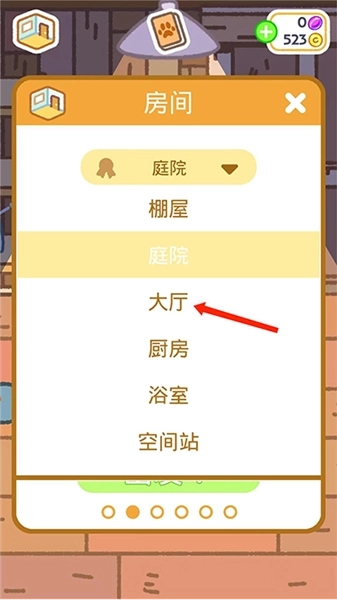 2、进入房间界面,其中包含棚屋、庭院、大厅、厨房、浴室、空间站等不同场景,这里我们选取【大厅】作为示例;