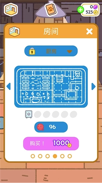 3、如图所示,点击【三角形】按钮能够切换至不同的房间,当收集到对应数量的毛绒球和金币后,就能解锁该房间。