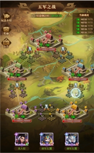 另一部分战场是五军之战,在这里,五服的军师将代表各自区服作战,进行营地驻扎、转移和出战调整。战斗开始后,每个相连的城池前军和后军会开始车轮战。由于战斗为适时进行,因此一旦发生了战斗,营地中的队伍就无法再进行调整了。战局瞬息万变,在战前及时地做出改变至关重要哦~