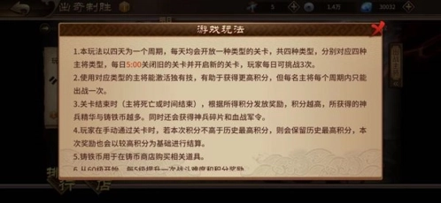 1.该玩法的一个周期为四天,每天开放的关卡类型各有不同,总计四种关卡类型,且分别与四种主将类型相对应;每天5:00会关闭前一天的旧关卡并开启当日新关卡,玩家每个自然日拥有3次挑战机会。
