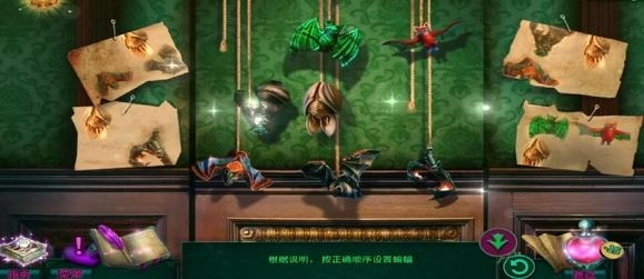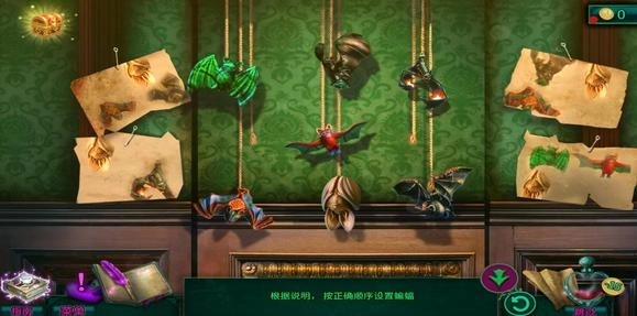 1、在密室逃脱12神庙之旅的蝙蝠关卡里,初始界面呈现的状态和图示一致。要依据旁边的四张图片,按照正确的顺序来调整蝙蝠的设置。