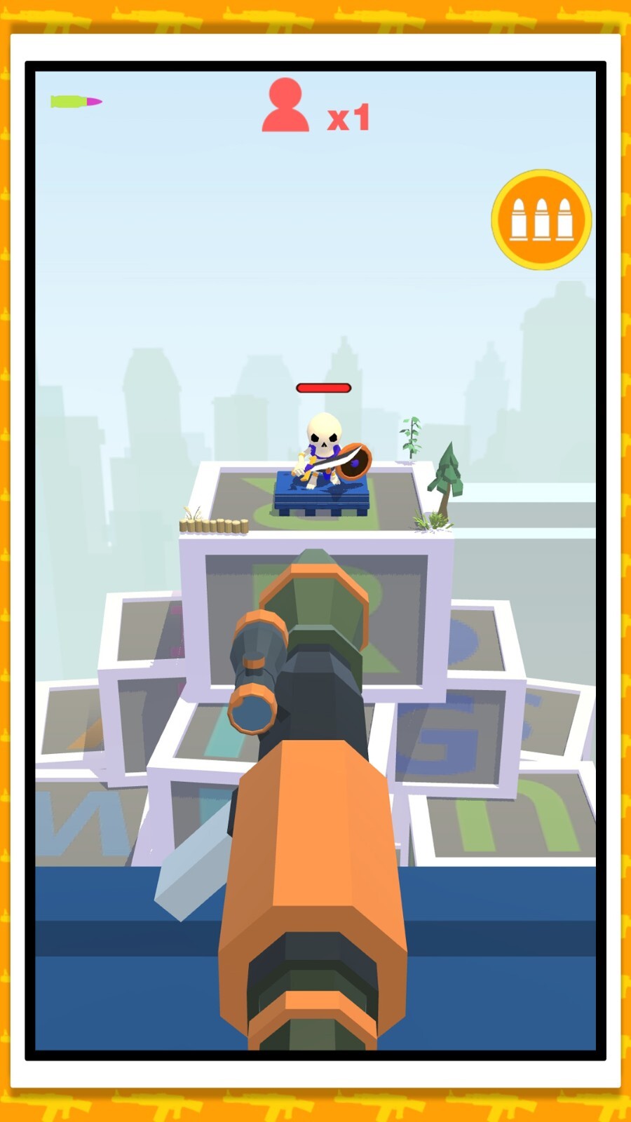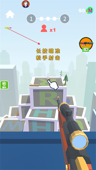 2、进入关卡后,屏幕里会出现目标敌人,按照提示长按进行瞄准,松手即可射击;长按屏幕时,还能通过移动手指来调整准星的位置。