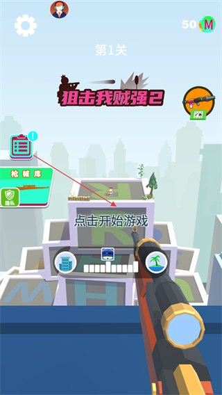 1、玩家结束游戏后回到主界面,可查看当前关卡的相关信息,点击对应图标及开始游戏按钮,即可进入狙击任务环节。