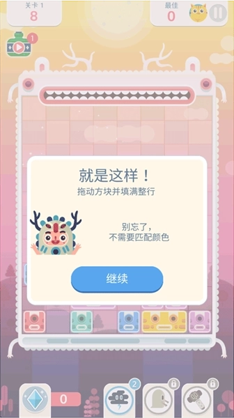 2、接下来进入实战环节,你需要拖动方块来填满整行。需要注意的是,这里不需要匹配方块的颜色。