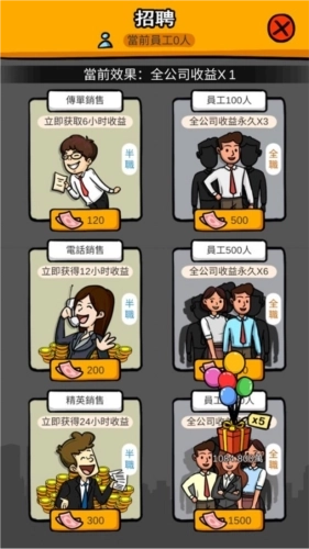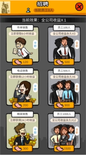 在《首富特烦恼》里,除了进行建厂、升级操作以及拉动投资外,玩家还能参与商战并开启全新项目。不过要知道,单靠自己的力量很难实现财富最大化,好在游戏设有“招聘”系统,通过招募销售、普通员工和精英人才,能够让公司的收益实现指数级增长。