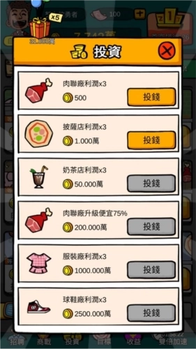 只要你具备出色的战略眼光,投资工厂、招揽人才,把企业……10亿对你而言确实只是个小目标。但我们的追求远不止于此——总有人渴望成为首富!来吧!在这里,你能够投资建厂。不同工厂的投资成本各异,收益情况和产生收益的周期也有所不同。工厂的等级越高,能赚取的利润就越丰厚。而升级工厂是需要投入资金的。