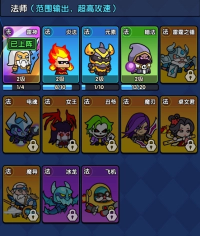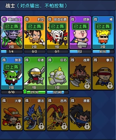 1、游戏里点击下方角色就能让其上阵,选定一个后另外两个角色会自动消失。每个职业里都存在能力各异的英雄,官方用金色、紫色、蓝色、绿色这些不同的色彩,来区分不同英雄的强度等级。